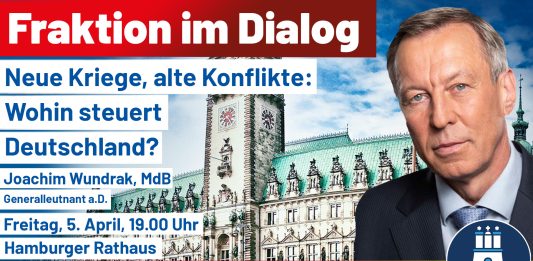 Am Freitag, 5. April, um 19 Uhr spricht der AfD-Bundestagsabgeordnete und Generalleutnant a.D. Joachim Wundrak im Hamburger Rathaus zum Thema: Neue Kriege, alte Konflikte: Wohin steuert Deutschland? Joachim Wundrak wurde 1955 in Kerpen geboren. Sein ganzes Berufsleben, über 40 Jahre lang, diente er Deutschland als Soldat und wurde Generalleutnant der Luftwaffe. In dieser Zeit folgten … Fraktion im Dialog mit dem AfD-Bundestagsabgeordneten Joachim Wundrak am 5. April weiterlesen