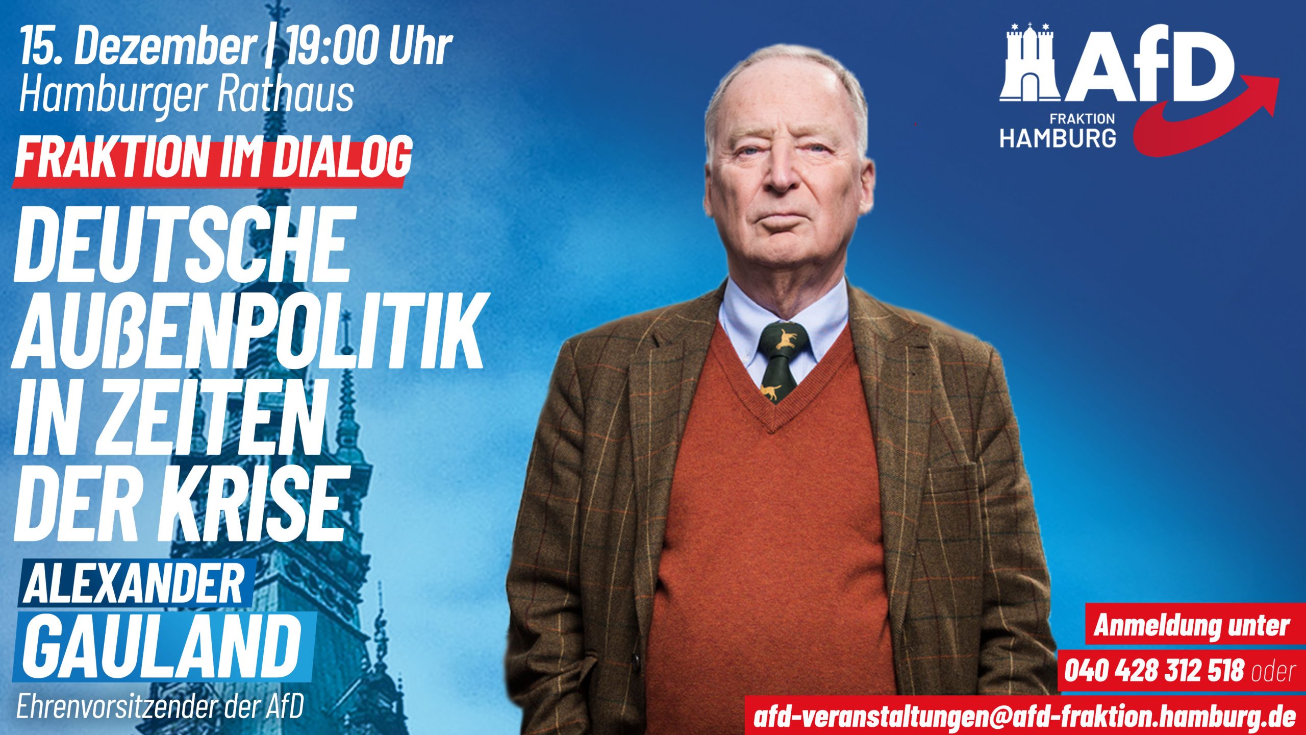 Am Montag, 15. Dezember, um 19 Uhr spricht der AfD-Ehrenvorsitzende Dr. Alexander Gauland (MdB) im Großen Festsaal des Hamburger Rathauses zum Thema: